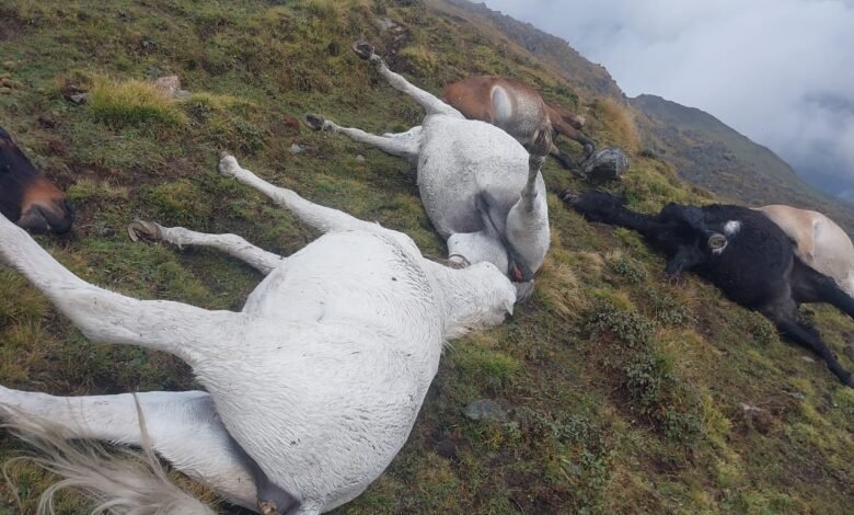 नंदा नगर के कनोल गाव के बुग्यालो मै 30 से अधिक घोड़े – खच्चरों के मरने की सूचना प्राप्त हुई है कनोल प्रधान पूजा नेगी ने बताया की आशमानी बिजली गिरने से यह घटना हुई है