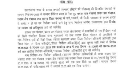 देहरादून – उत्तराखण्ड राज्य के समस्त जनपदों (जनपद हरिद्वार को छोड़कर) की त्रिस्तरीय पंचायतों के सामान्य निर्वाचन-2025 के उपरान्त विभिन्न…