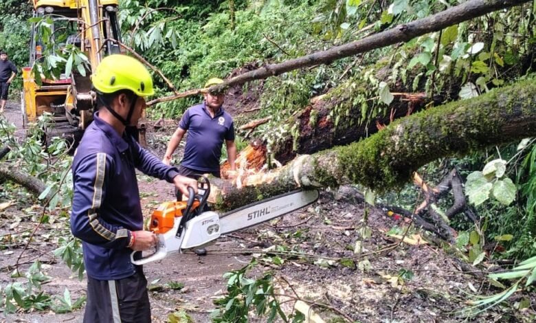चुनौतियों के बीच दो पेड़ो को काट कर मार्ग सुचारु