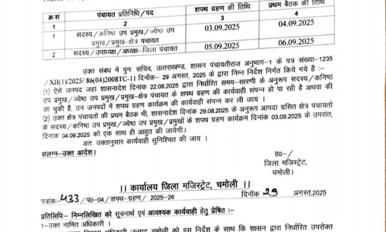 प्रदेश दब शुक्रवार को कई विकास खंडो को शपत हुआ है लेकिन आपदा के कारण शपत नही हुआ है उन जगहों पर अब 3 सितम्बर को व पहली बैठक 4 सितंबर को होना तय हुआ है प्रदेश सरकार ने नया आदेश जारी किया गया है प्रदेश मै आपदा के कारण प्रदेश मै बहुत अधिक नुकसान हुआ है जिस कारण सरकार ने नयीं एडवाई जारी जारी किया है