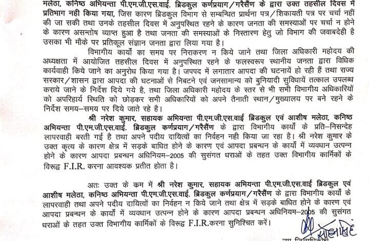 उलेखनीय है मंगलवार को गैरसैण्ड मै तहसील दिवस के दौरान पी ए एम जी एस वाइ के के सहायक अभियंता नरेश कुमार व कनिष्ट अभियंता आशीष मलेठा तहसील दिवस मै उपस्थित नही होने के करण जिलाधिकारी ने दोनो के खिलाप आपदा प्रबंधन की धारा 2005 मै फराइ की गयी है क्यो कि इनको अपने अधिकारियो के आदेश कि अवहेलना के तहत यह आदेश किया गया है माना जा रहा है कि जिलाधिकारी पौड़ी के खिलाप भी इजीनियर असोसिएशन उनके खिलाप हो गये है जिलाधिकारी चमोली संदीप तिवारी ने उक्त पी एम जी एस वाई के खिलाप आम जनता कि भी राय ली गयी है जबकि उनको आपदा के समय जब पुरा प्रदेश परेशान है इस स्थिति मै अपनी जबाब देही समझनी चाहिए थी लेकिन ऐसा नही हुआ जिसे देखते हुए जिलाधिकारी चमोली को यह निर्णय लेना पड़ा ।