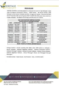 हेरीटेज कम्पनी के सी ई ओ ने बताया कि यह सेवा दुर्गम पहाड़ी क्षेत्रों की जनता के लिए लाभकारी होगी और चौबीसों घंटे सेवा के लिए हमारी हैली सेवा तत्पर रहेगी और अन्य कम्पनियों की हैली सेवा से हैरीटेज कम्पनी की हैली सेवा किराया न्यूनतम रहेगा देहरादून न्यू टिहरी श्रीनगर जौलीग्रांट को सुबह 10 15 से सेवा प्रारम्भ होगी जो कि आम जनता के हितेषी के लिए वरदान साबित होगा।