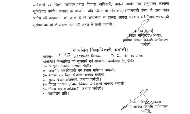 जिलाधिकारी के आदेश में कहा गया है कि वन्य जीव संघर्ष को देखते हुएविद्यालयों का खुलना का समय प्रातः 10:00 बजे से 3:00 बजे तक रहेगा जिला शिक्षा अधिकारी ने विद्यालयों को यह आदेश 15 जनवरी 2026 तक लागू रहेगा । जब की आंगनवाड़ी का समय प्रात 10: 00 बजे से अपराह्न 1:00 बजे तक रहेगा।