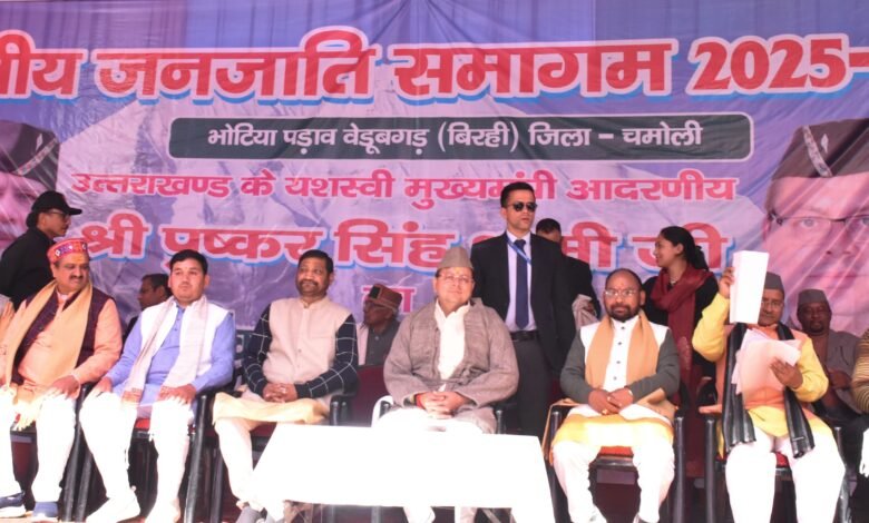 मुख्यमंत्री श्री पुष्कर सिंह धामी ने आज जनपद चमोली के बिरही (बेडूबगड़) में नीति-माणा जनजाति कल्याण समिति चमोली की ओर से आयोजित *तीन दिवसीय “जनजाति समागम 2026” के समापन कार्यक्रम में प्रतिभाग किया। इस अवसर मुख्यमंत्री ने दीप प्रज्वलित करते हुए सभी का अभिनन्दन किया एवं भोटिया समुदाय की नीति माणा की महिलाओं ने पारंपरिक परिधान में मुख्यमंत्री का स्वागत किया।