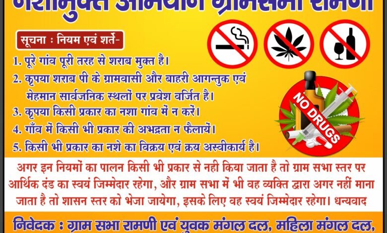 अब रामनी गांव भी होगा नशे से मुक्त ,नही माने तो होगा 50 हजार का जुर्मना