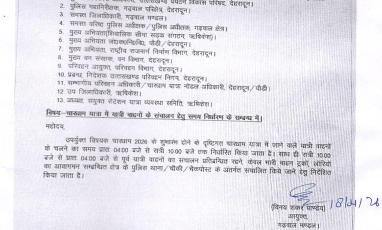 श्री विनय शंकर पांडे आयुक्त गढ़वाल मंडल के निर्देशों के तहत यात्रा मार्गों पर यात्रियों के वाहनों का संचालन सुबह 4 बजे से रात्रि 10 बजे तक निर्धारित किया गया है।* रात्रि 10 बजे से सुबह 4 बजे तक यात्री वाहनों का संचालन यात्रा मार्ग पर प्रतिबंधित रहेगा और केवल भरी वाहन जैसे ट्रक , लॉरियो का आवागमन संबंधित क्षेत्र के पुलिस थाना / चौकी/ चेकपोस्ट के अंतर्गत संचालित किया जाएगा। इस दौरान सुरक्षा एवं यातायात व्यवस्था को सुदृढ़ बनाए रखने के लिए पुलिस, प्रशासन तथा संबंधित विभागों को समन्वय के साथ कार्य करने के निर्देश दिए गए हैं।